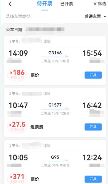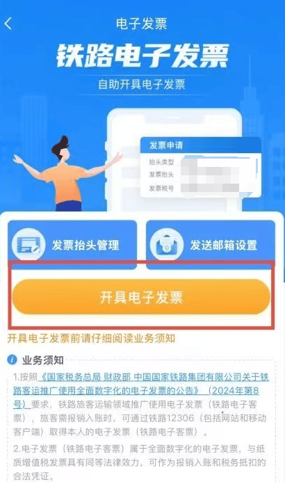 打开铁路12306App,在“我的”里面找到“电子发票”,点击“开具电子发票”,即可在电子发票管理页面,看到尚未开票的行程。
