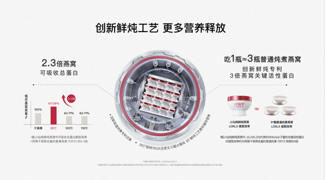 工艺与体验:小仙炖科研团队与山东大学、兰州大学的科研证实,与家庭炖煮燕窝相比,用小仙炖95℃创新鲜炖工艺(炖煮设备专利号ZL201920321925.4)炖煮的燕窝里以MUC5AC与LOXL3为代表的关键活性蛋白总含量是等量原料的家庭炖煮燕窝的3倍多,能够300%激发燕窝的活性营养,吃1瓶小仙炖鲜炖燕窝等于吃3瓶家庭炖煮的燕窝,每一口满满营养,让滋补更高效。产品配方仅含燕窝、冰糖、纯净水,0激素、0防腐、0增稠,经山东大学检测 115 种激素未检出,无糖方案适配控糖女性及孕期妈妈。温和配方不刺激肠胃,孕期、产后、术后等有特殊需求的女性都可安心食用。