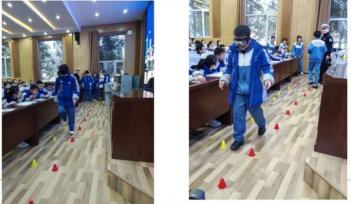 此外,活动现场设置“酒醉驾模拟体验”环节。在民警的指导和保护下,学生们戴上特制的模拟眼镜,直观感受酒后视觉模糊、判断力下降、行动不协调的状态,切身体会酒驾醉驾的危险性,从内心深处树立拒绝酒驾醉驾、遵守交通规则的意识。