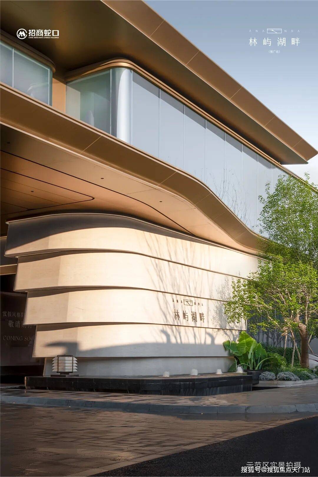 契合远香湖地缘要素,招商·林屿湖畔的外立面以“游艇”为元素,底部石材,弧形铝板结合大面积玻璃幕墙,创造出波光潋滟的视觉效果。香槟色金属光泽与浅米色石材交织,在远香湖的映衬下,呈现出如水波荡漾的灵动效果。
