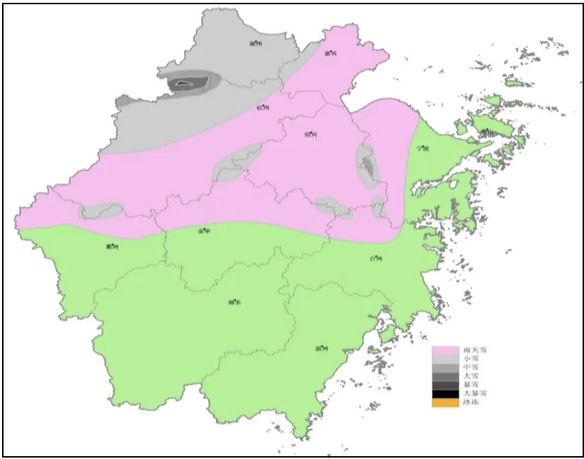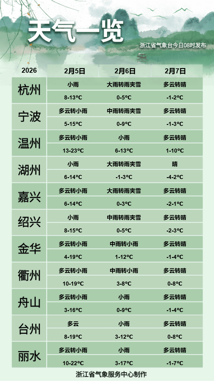 6日中午起浙北部分山区率先转雨夹雪或雪,部分中到大雪,高山区局部暴雪;下午浙北部分平原地区有雨夹雪,夜里雨夹雪或雪。
