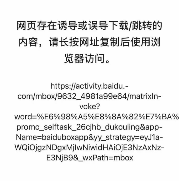 【太平洋科技快讯】2月5日消息,继封杀自家腾讯元宝红包链接后,百度文心助手红包分享链接被微信屏蔽,并提示:“网页存在诱导或误导下载/跳转的内容”,要求用户复制到浏览器访问。被微信封禁后,百度文心红包分享机制已调整为口令红包,用户需手动复制口令至百度App内参与相关活动。