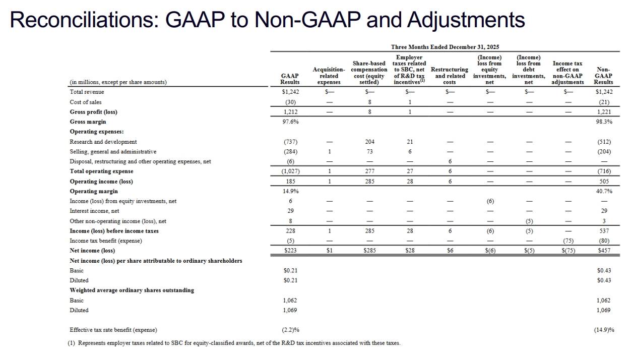 2月4日,半导体IP大厂Arm公布了截至2025年12月31日的2026会计年度第三季财报。受益于AI芯片设计授权增长及数据中心需求推动,Arm的第三财季业绩超出市场预期,但市场对其授权费收入(licensing)不如预期反应谨慎,引发盘后股价大跌7.45%至每股97.05美元。
