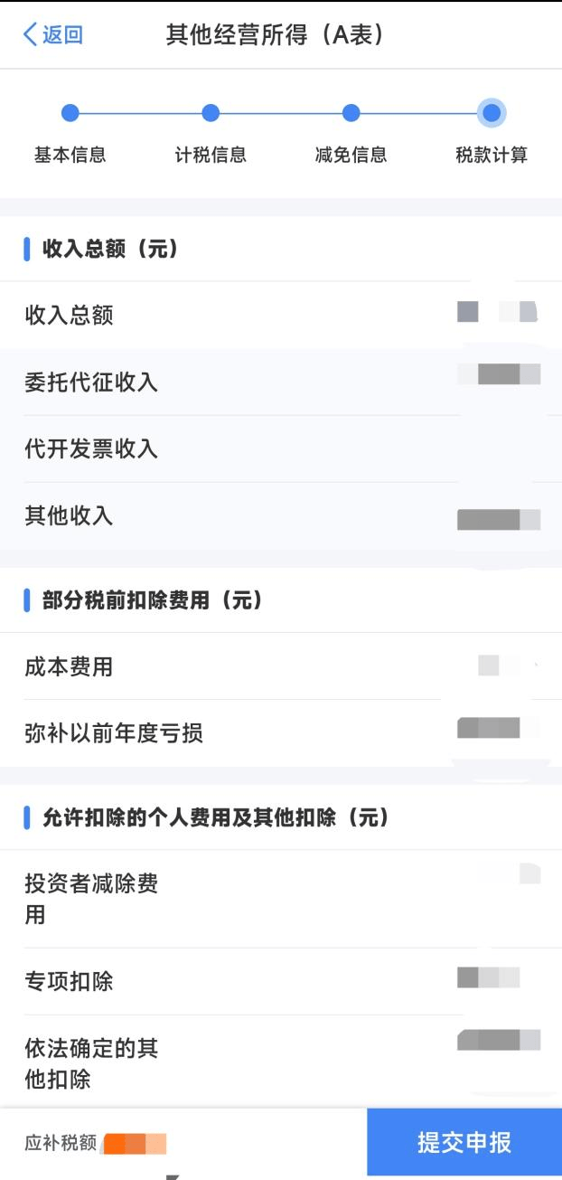 在“计税信息”界面,“委托代征收入”和“代开发票收入”由系统自动带出,若有“其他收入”可在【其他收入】栏中填写,填写完毕后在“收入总额”中会显示三项的合计数值。根据实际情况在【成本费用】栏填写业务产生的成本,再根据个人实际需要填写【弥补以前年度亏损】,在“允许扣除的个人费用及其他扣除”选择【是否均在综合所得中扣除】,若有个人捐赠可选择填写【准予扣除的个人捐赠支出】。以上信息填写完毕后点击下一步。