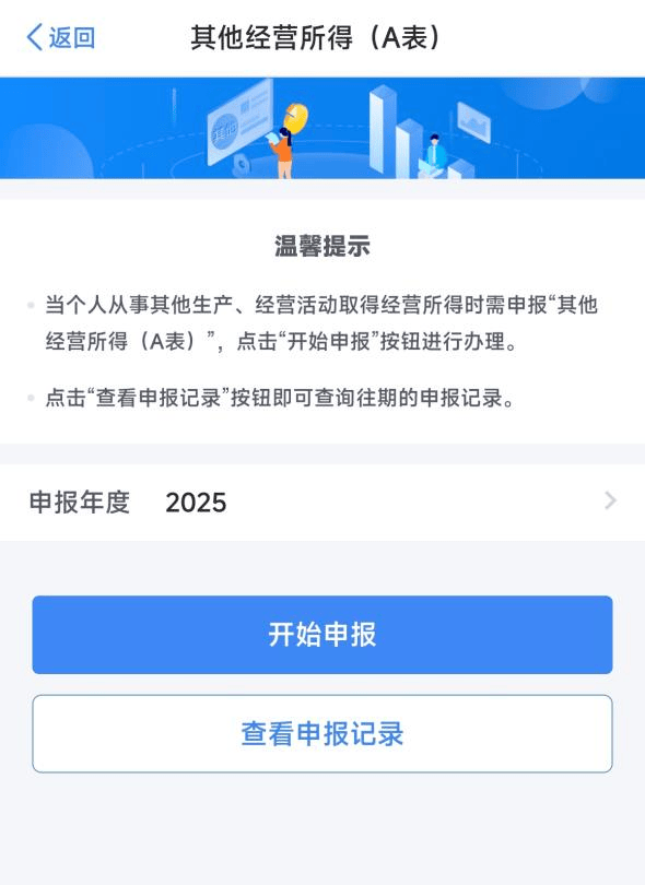 进入【其他经营所得(A表)】界面,选择需要申报的年度,点击“开始申报”进入申报环节;