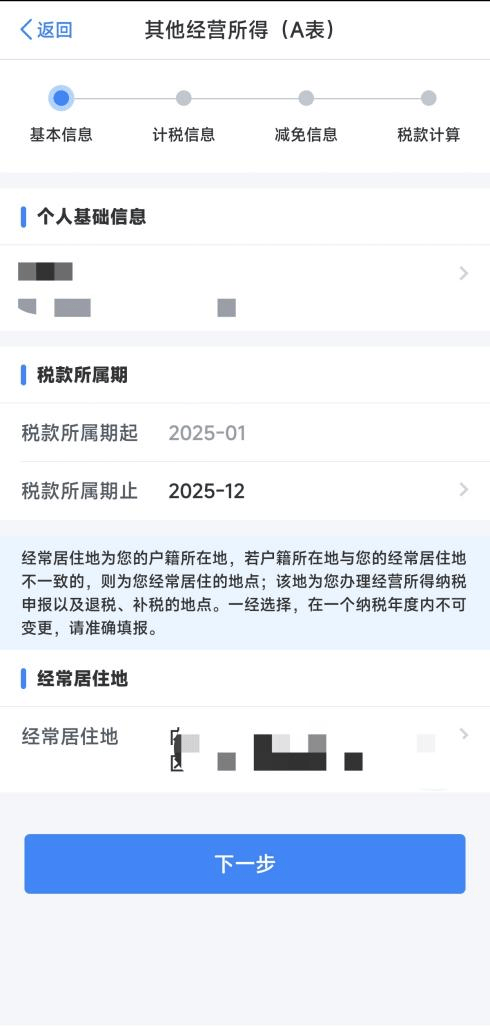 选择【税款所属期止】和【经常居住地】,选择完毕后点击下一步。(注意:经常居住地为您的户籍所在地,若户籍所在地与您的经常居住地不一致的,则为您经常居住的地点;该地为您办理经营所得纳税申报以及退税、补税的地点。一经选择,在一个纳税年度内不可变更,请准确填报。)