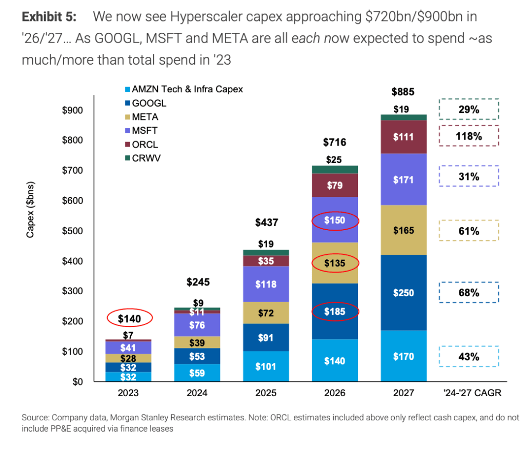 值得关注的是,根据摩根士丹利测算,该指引金额已超出2023年全球六大云服务商数据中心总支出的32%。若与近期Meta宣布的1350亿美元投资计划相比,Alphabet的投入规模更显突出,后者仅较2023年行业总支出低约4%。