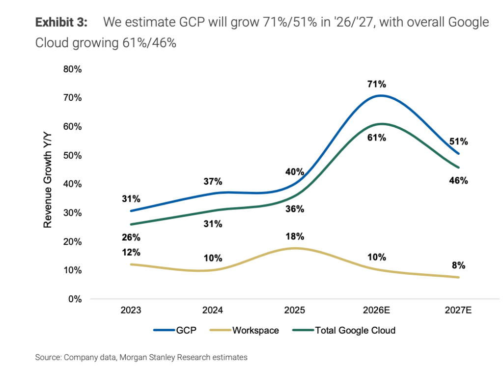 业务的能见度进一步提升。截至四季度,云业务积压订单环比增长55%至约2400亿美元,同比实现翻倍。据此,摩根士丹利预测GCP在2026与2027财年将分别实现71%与51%的增长。