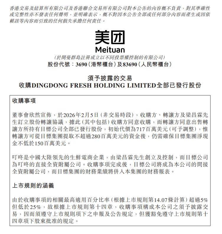 2月5日,生鲜电商领域迎来开年以来最重磅的收并购消息。当天,美团发布公告,以约7.17亿美元(约49.8亿元人民币)的初始对价,收购叮咚买菜中国业务100%股权。这也成为2026年本地生活领域首笔超大型并购案,标志着生鲜即时零售行业整合升级进入关键阶段。