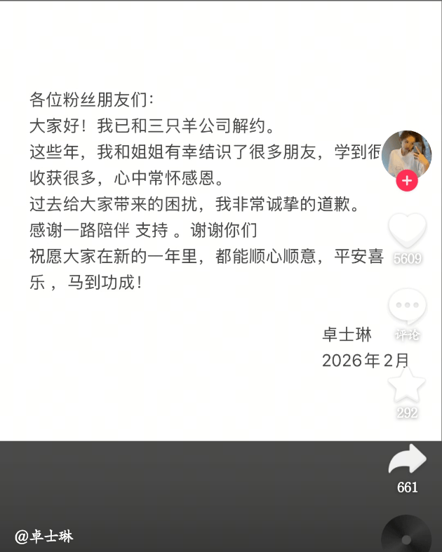 近日,三只羊大主播卓士琳通过个人社交账号发布解约声明。卓士琳在声明中表示,已和三只羊公司解约,其感谢粉丝一直以来的支持并为过往困扰致歉。