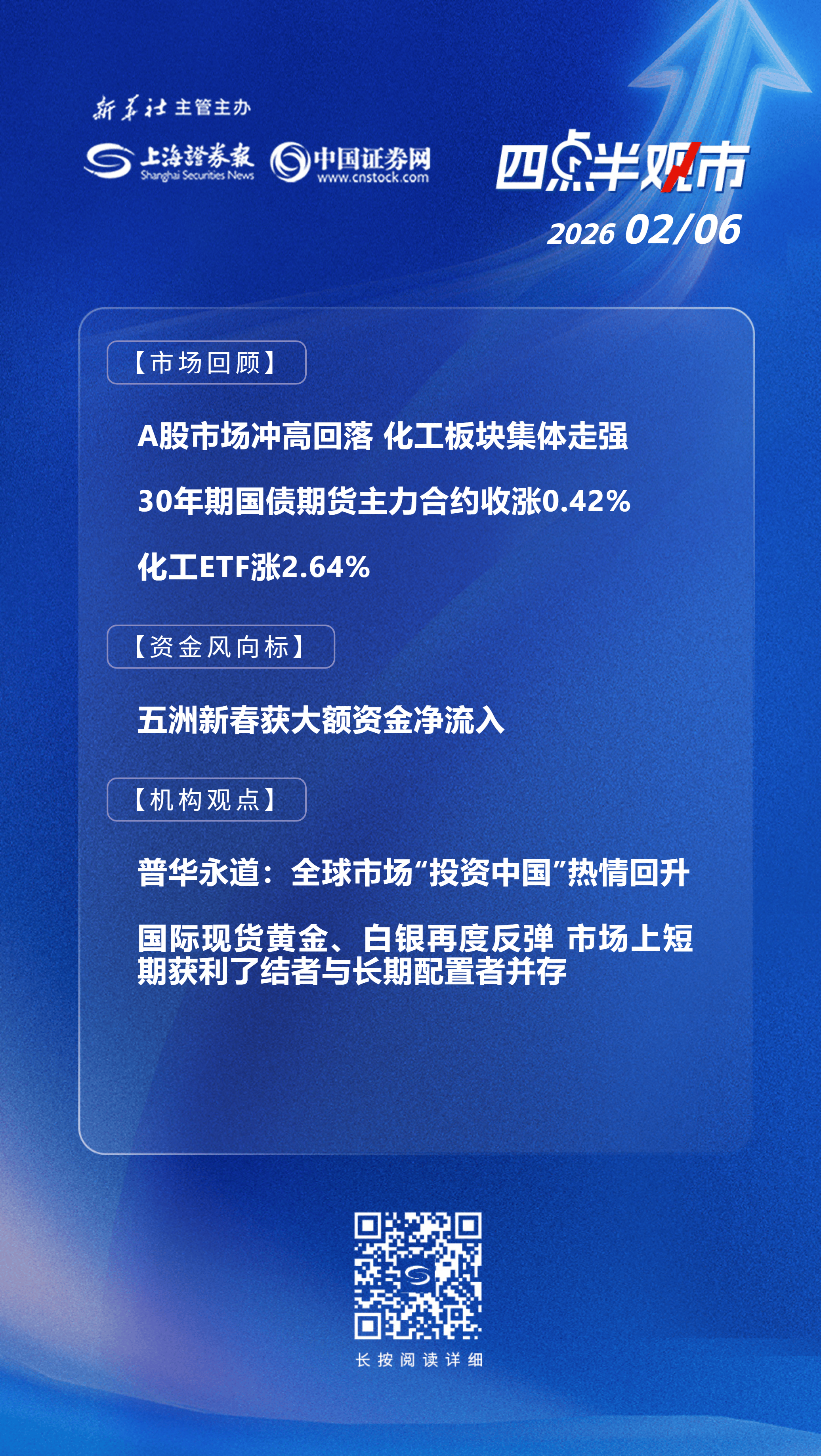 A股市场冲高回落 化工板块集体走强;日韩股市收盘涨跌不一;30年期国债期货主力合约收涨0.42%;化工ETF涨2.64%;资金风向标:五洲新春获大额资金净流入;普华永道报告:全球市场“投资中国”热情回升;国际现货黄金、白银再度反弹 机构:市场上短期获利了结者与长期配置者并存。