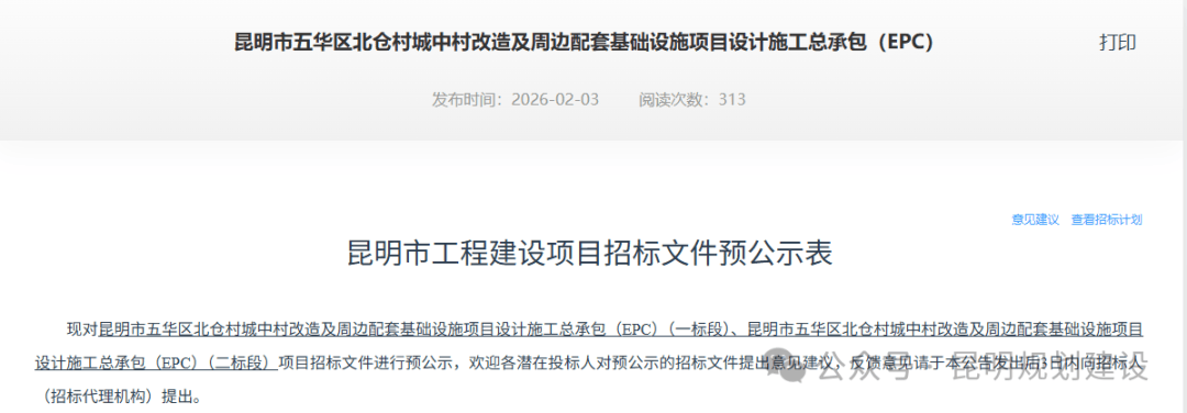 2月3日,云南省公共资源交易信息网发布《昆明市五华区北仓村城中村改造及周边配套基础设施项目设计施工总承包(EPC)》招标文件预公示。