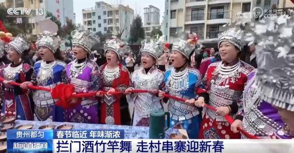 在贵州省都匀市思源社区,大家齐聚一堂,摆上拦门酒、跳起竹竿舞、共享刨汤宴,年味十足。