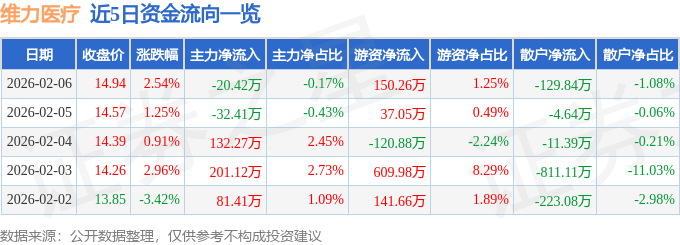 证券之星消息,截至2026年2月6日收盘,维力医疗(603309)报收于14.94元,上涨2.54%,换手率2.79%,成交量8.13万手,成交额1.21亿元。