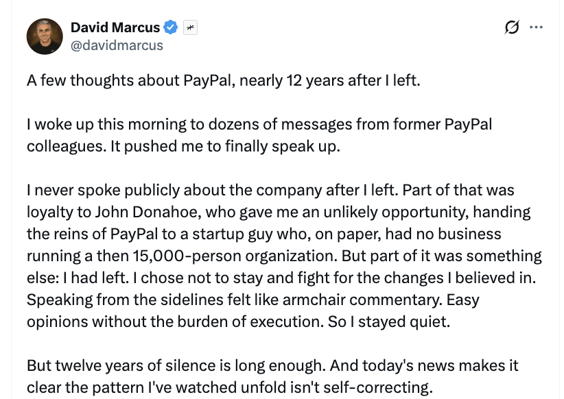 对此,曾在 2012 至 2014 年担任 PayPal 总裁的 David Marcus,离开公司十二年后首次打破沉默,于 X 平台上发长文,系统性地回顾自己眼中的 PayPal 的这些年。