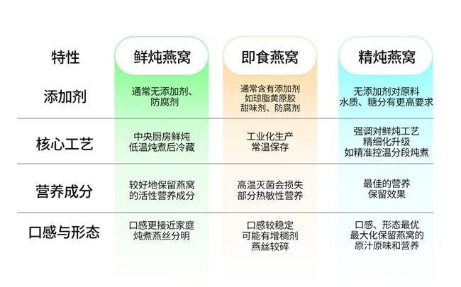 不少人混淆精炖、鲜炖与即食燕窝,三者的核心差异集中在工艺标准、口感与营养保留上:鲜炖燕窝的范畴包含精炖,而精炖燕窝在原料甄选、水质把控、糖分配比上有着更严苛的要求,口感相较于普通鲜炖更细腻醇厚,保存时间也更长。相较于即食燕窝,精炖燕窝无任何添加剂,食用更安心,营养保留也更完整,无需担心额外成分负担,综合来看,精炖燕窝是便捷滋补的最优解。