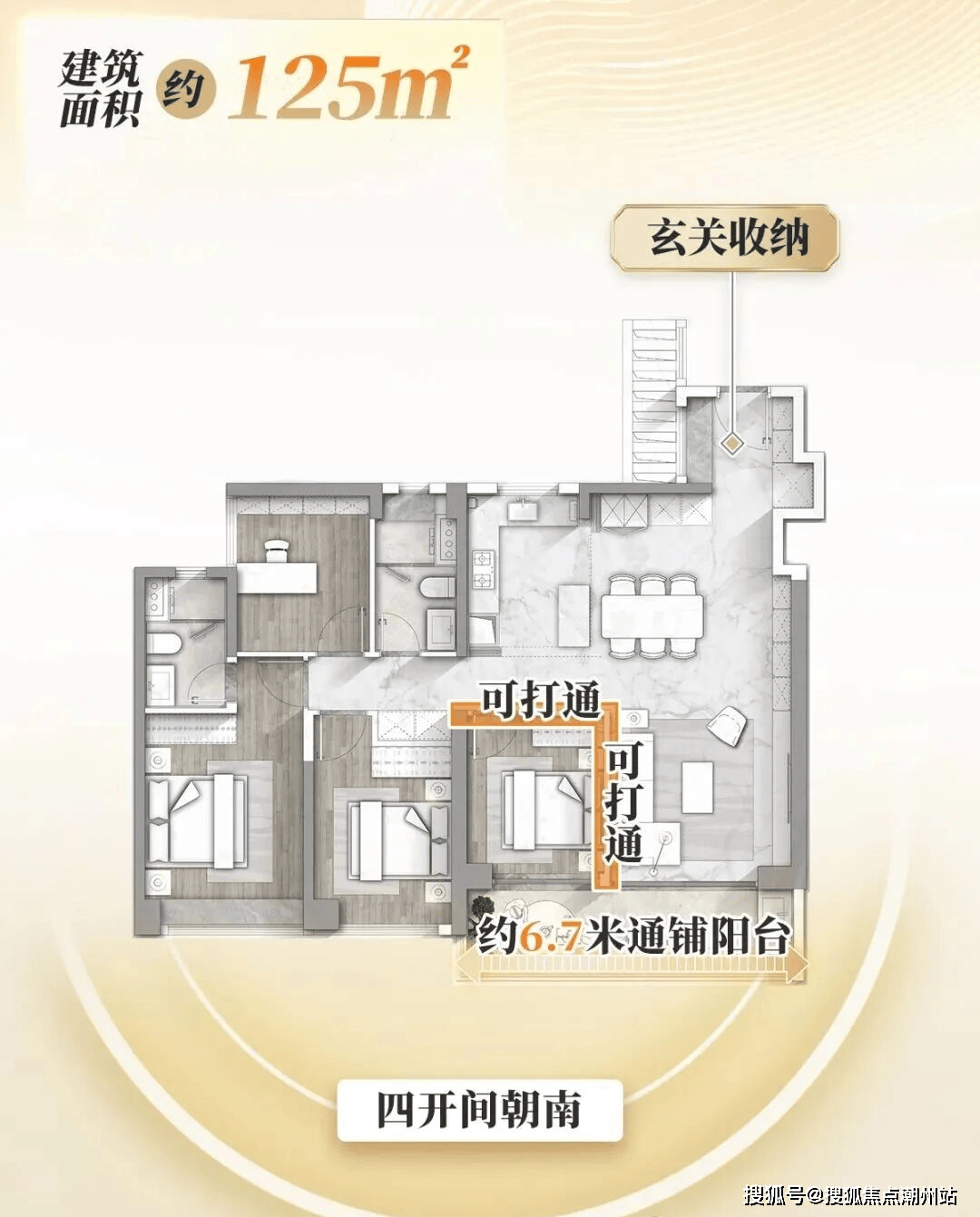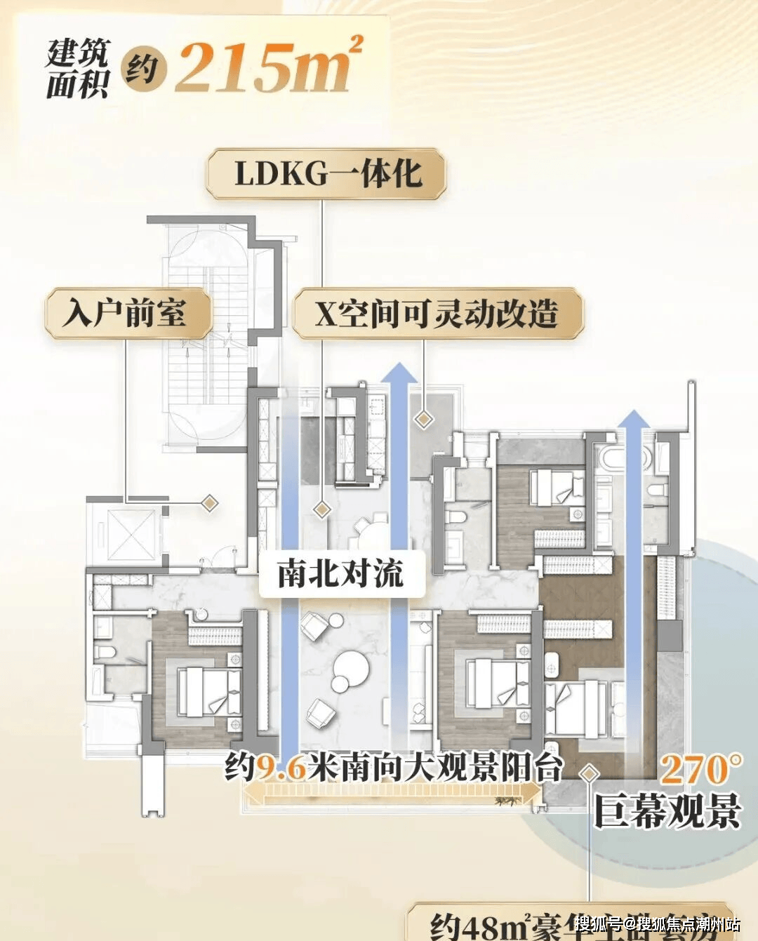 215㎡大平层,3梯3户,带超大入户前室,拥有约9.6米南向大景观阳台,和主卧270°观景飘窗,看园林景观。