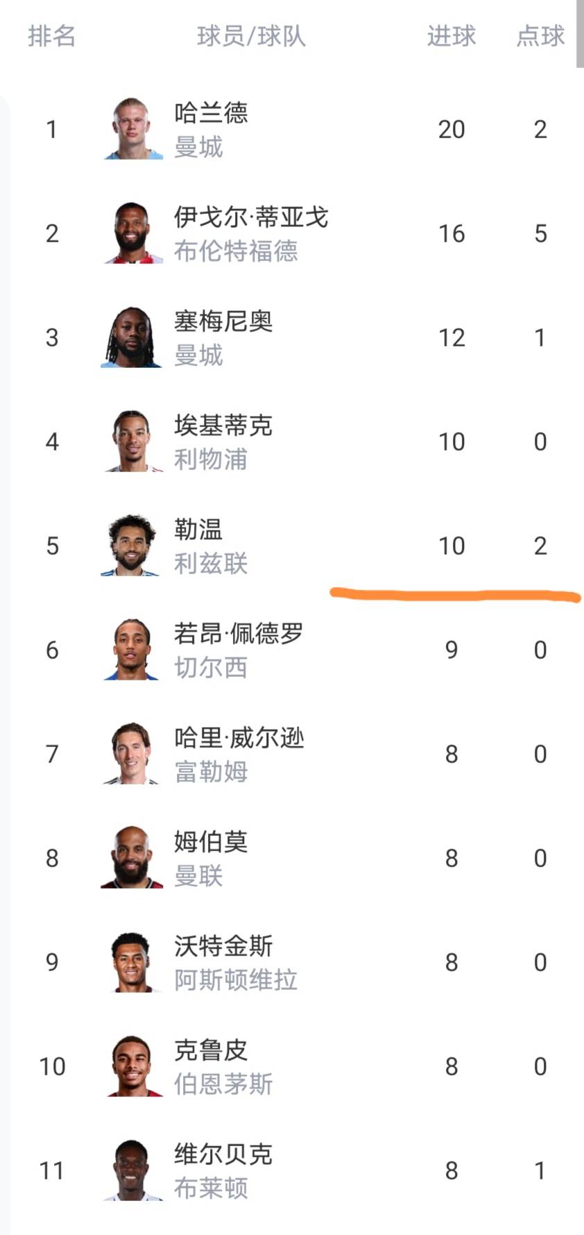 射手榜上有5名球员已经进球上双了。