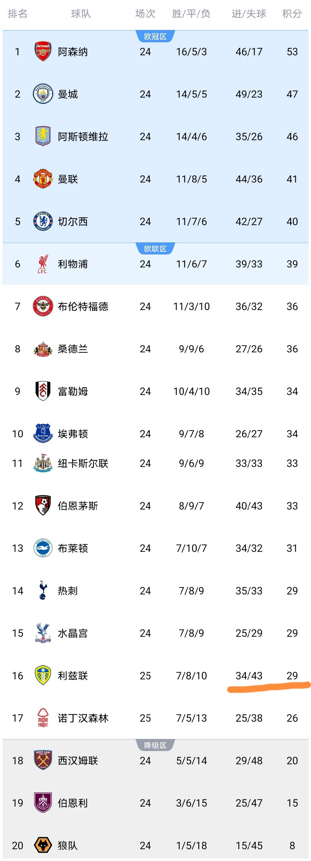 可以看到利兹联取得胜利之后,积分上涨到了29分,排名第16位,领先降级区9分之多,可以说利兹联保级希望大增,而诺丁汉森林队输球之后,积分停留在了26分,领先降级区6分,诺丁汉森林还需要继续努力啊,不能放松,否则可能会被西汉姆联队反超啊。