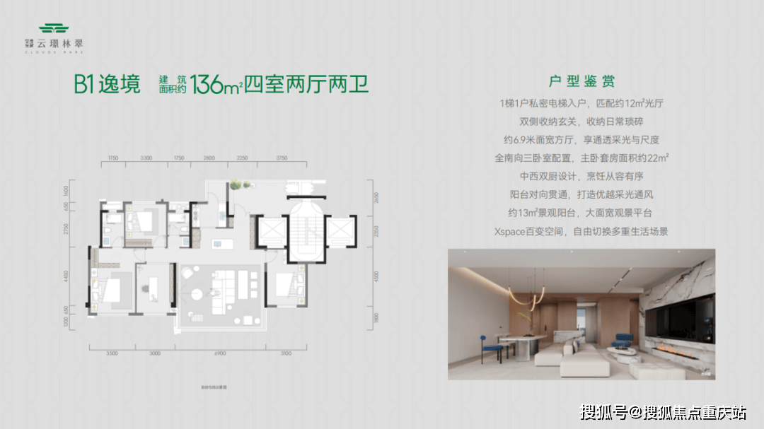 而建面约136㎡的逸境户型,则为改善型客户提供了更优选择。作为总高17层的产品,它拥有两梯两户的尊崇配置,视野极佳。户型亮点纷呈:约6.9米、拥有270度转角环幕采光面的观景方厅,让阳光与风景成为生活的日常背景;创新的洄游式社交厨房设计,让烹饪成为家人交流的乐趣;三房朝南的全明格局与步入式衣帽间的尊贵主卧,共同定义了高品质的舒居标准。其室内承重墙少,为未来家庭结构的变化预留了极大的改造可能性,满足了全生命周期的居住需求。