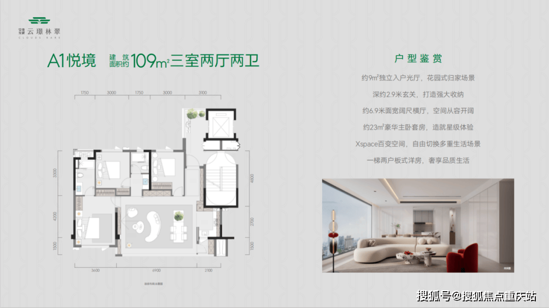 其中,建面约109㎡的悦境户型,堪称当代年轻家庭首选的刚改不二之选。其采用总高仅11层的一梯两户设计,每栋仅22户,确保了居住的私密性与纯粹性。户型内部,约8.9米奢阔观景阳台连接LDKG一体化横厅,不仅实现了空间的“零浪费”和近100%的得房率, 更创造了一个开阔、互动的家庭社交中心。此外,约9㎡的私享电梯厅、海量收纳的玄关设计以及可根据家庭需求灵活改造的“X空间”,每一处细节都体现了对现代人居需求的深刻洞察,堪称同面积段产品中的革新之作。