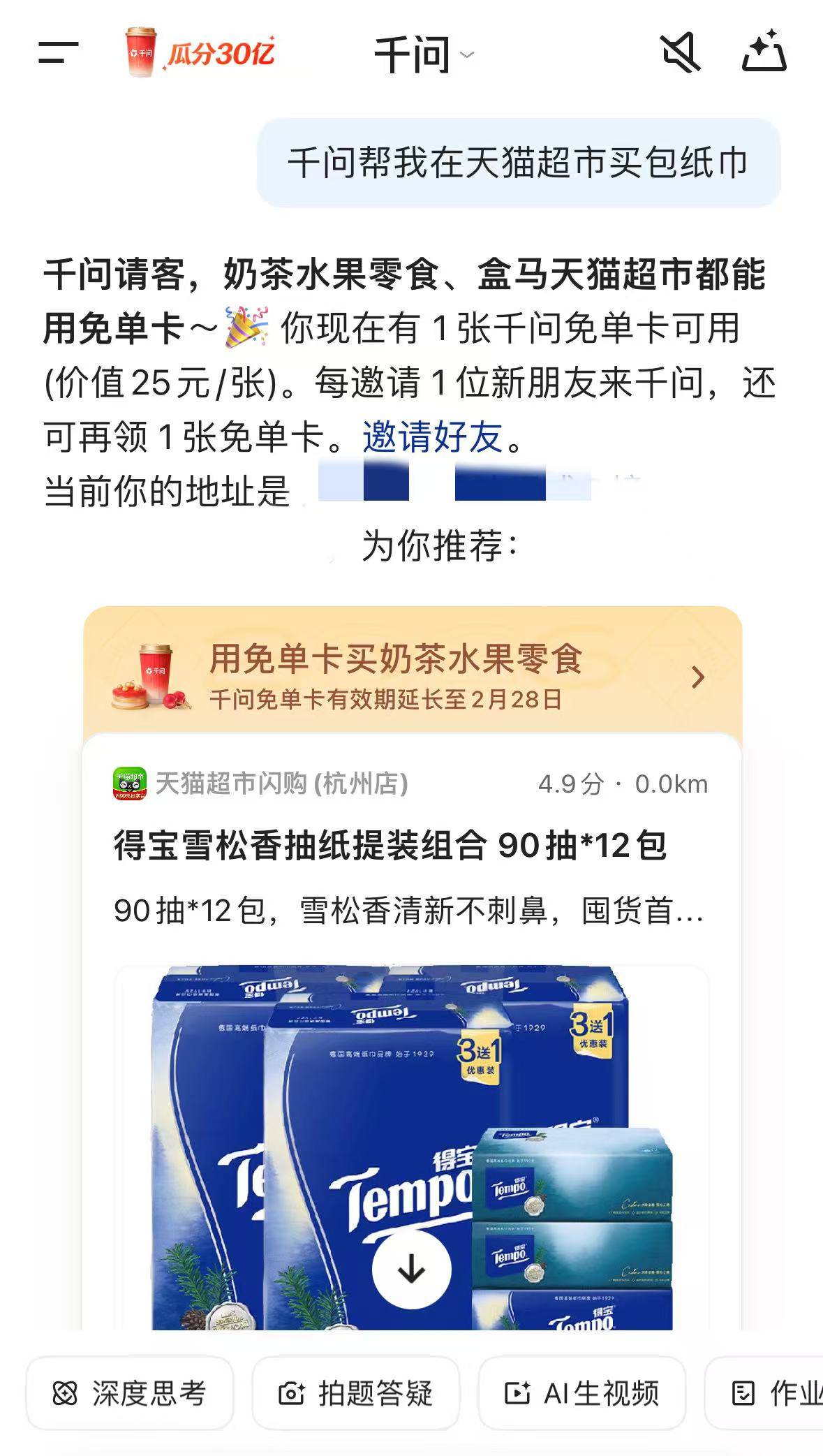 2月7日,千问APP宣布,「免单卡」可以在千问APP里买天猫超市的酒水零食、米面粮油、家居日用、生鲜水果等,一句话下单就能送到家门口。