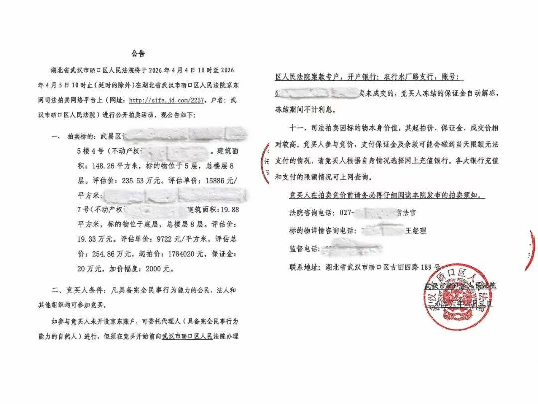 目前的最新进展是:实际施工人孙园意再次面临绝境:武汉市硚口区法院日前发布拍卖公告,其名下位于武汉市武昌区读书院49号城市花园的唯一住房将于2026年4月4日在京东网进行拍卖。
