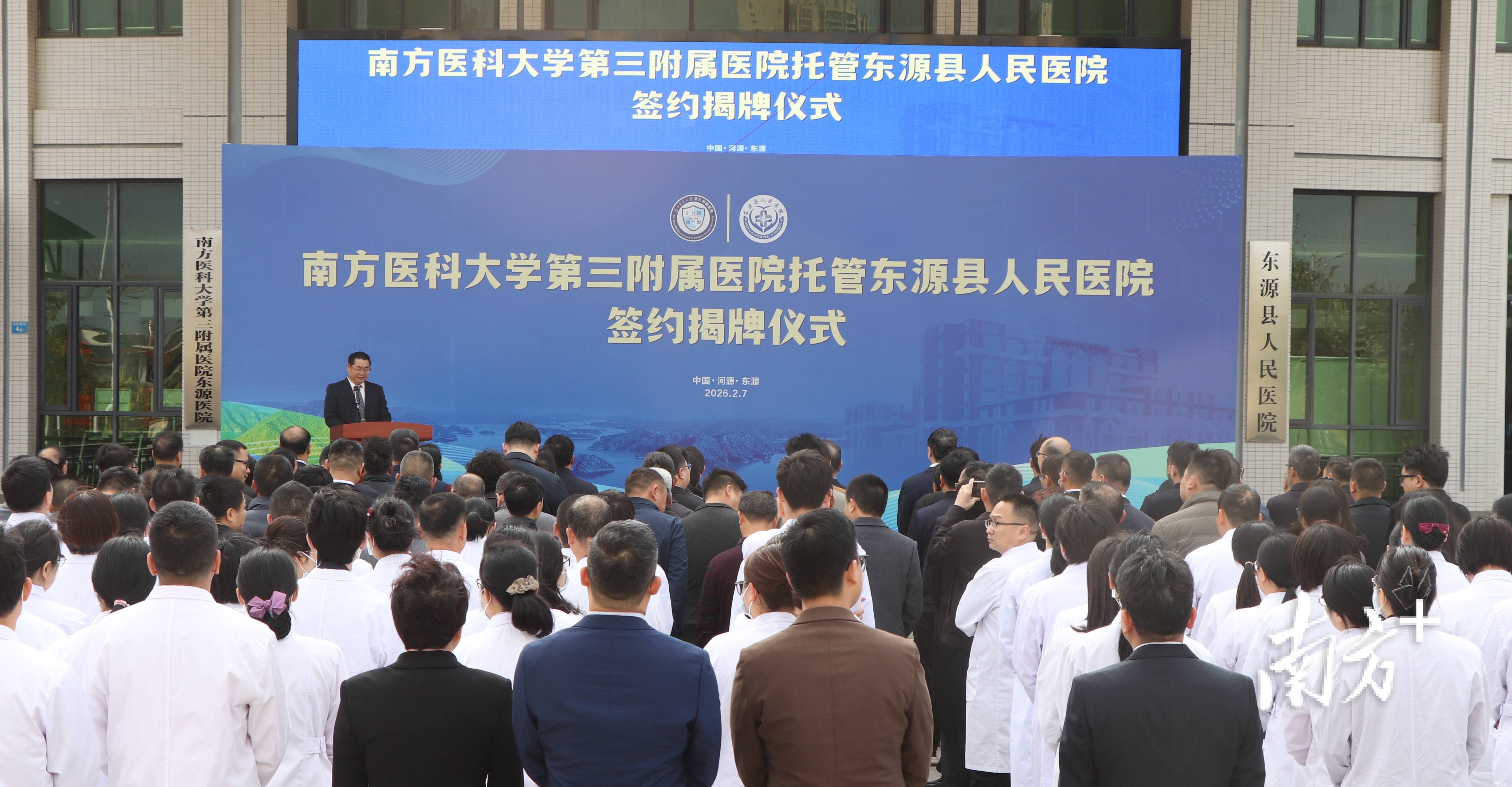 2月7日上午,南方医科大学第三附属医院托管东源县人民医院签约揭牌仪式举行。继2025年双方开展合作院区模式后,今年起,南方医科大学第三附属医院(下称“南医三院”)全面托管东源县人民医院,双方从技术帮扶为主的“松散合作”正式升级为深度融合的“命运共同体”,旨在为东源及周边区域百姓提供更优质、更便捷的医疗服务。
