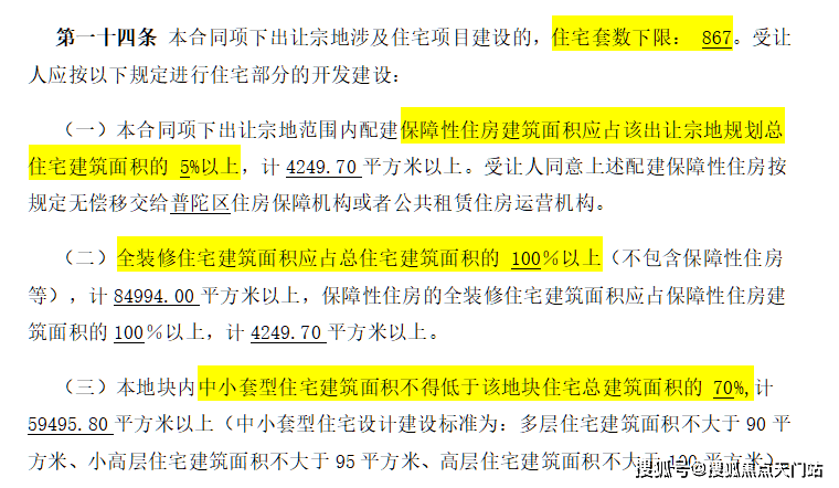 地块用地性质为普通商品房,容积率约2.5,限高80米,住宅套数下限867套,需配建5%以上保障性住房,中小套户型不得低于70%,全装修比例100%!