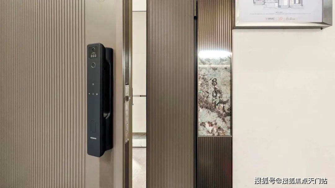 尚未入户,自带猫眼的四合一智能门锁,配合定制的门牌号与logo集合而成的入户门,彰显着主人的品位与尊贵地位。