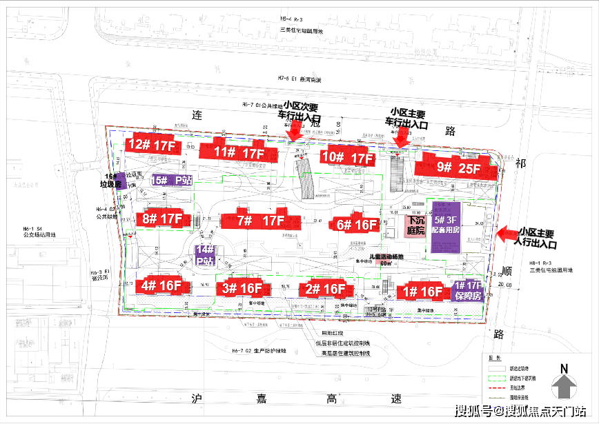 其中1号楼靠近17层的保障房,5号口为3层的配套用房;14#、15#为P站,16#为垃圾用房。