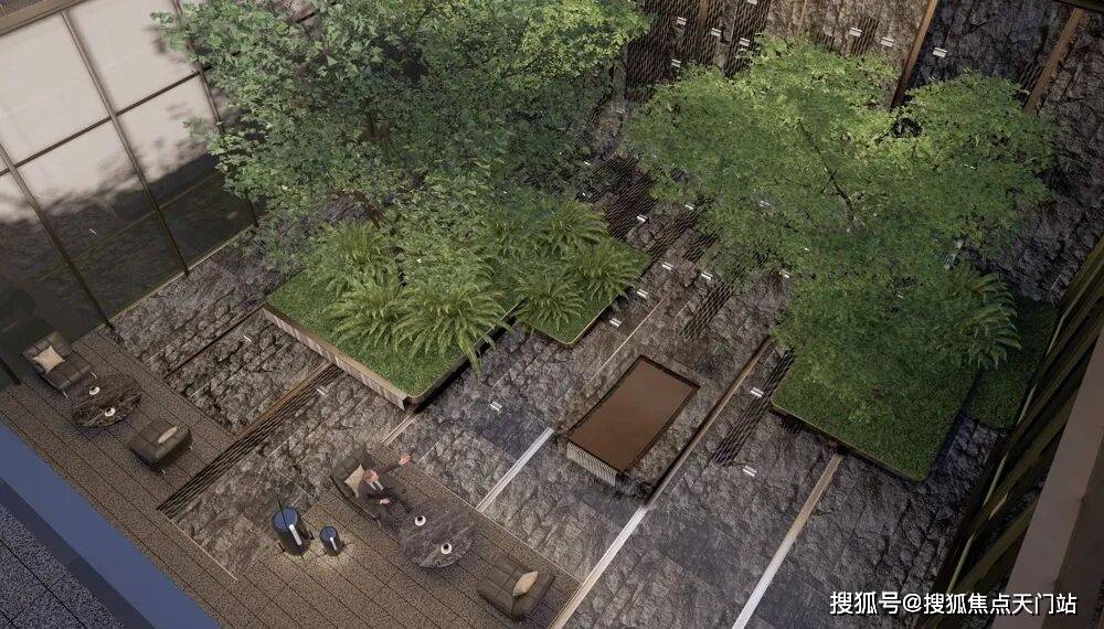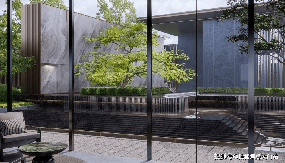 第五重:下沉庭院打造一体式景观,墙面流水至地面,结合水中花池营造出纯粹的自然之境。
