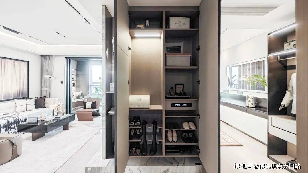 入户后,所有玄关柜均为交付标准,还精心配置了“除臭精灵”,下方更预留了扫地机器人的空间,为日常起居提供便利;像传统的豪宅三大件,项目采用大金品牌中央空调地暖两联供,以及格兰斯柯的新风。