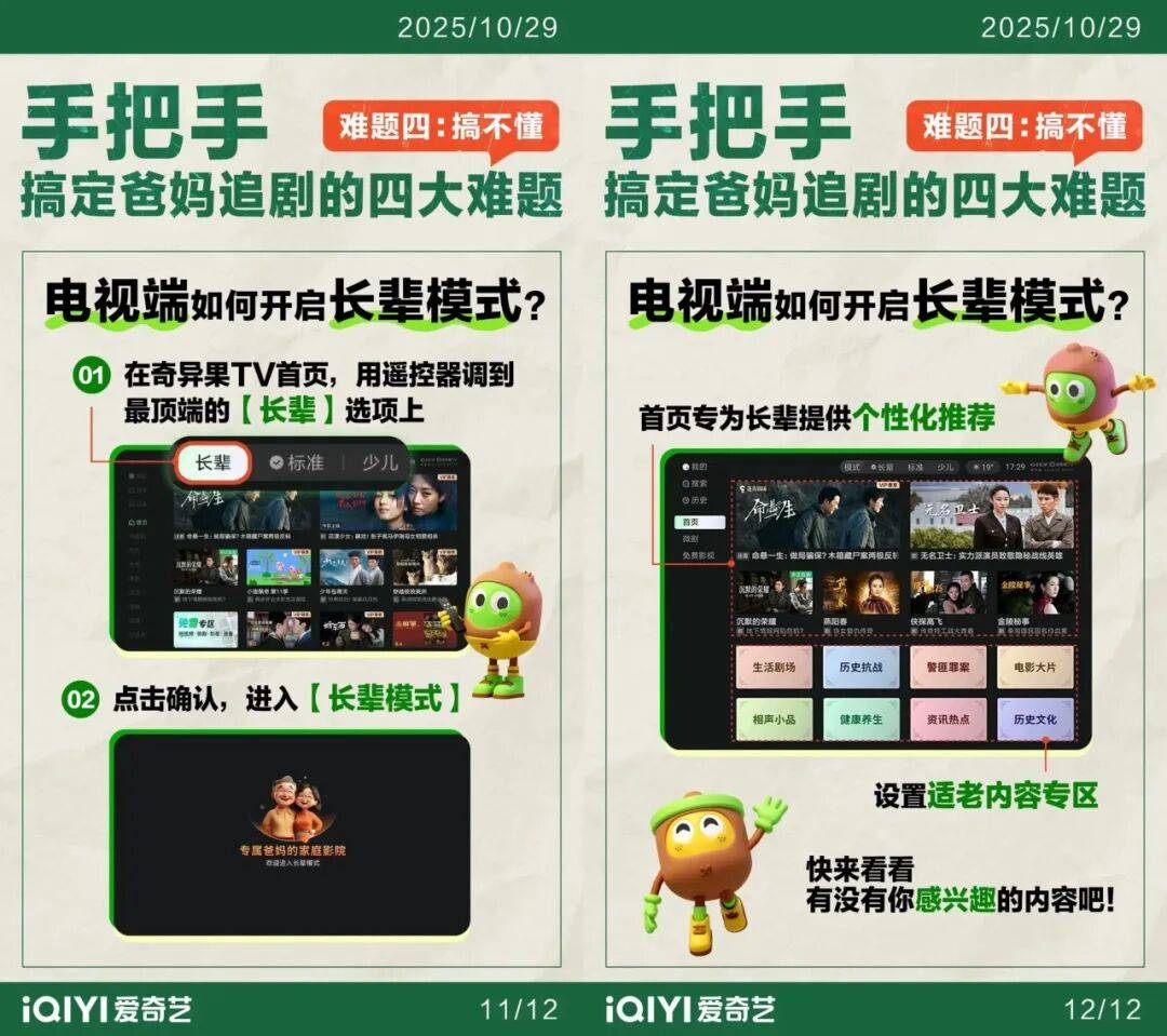 这样的情况并非个例,这些体验背后是视频平台进行的一系列更具情感温度的产品设计。近两年,爱奇艺推出的多项运营策略精准贴合了教师、学生、老人、儿童等群体的具体需求:如为教师和学生提供高性价比的会员订阅特惠,为老人提供专属的「长辈模式」,通过「奇巴布」产品守护小朋友、让家长放心;还在社交需求满足上,为用户提供了亲情卡、礼品卡等全新产品,串联起家人挚友间的牵挂。