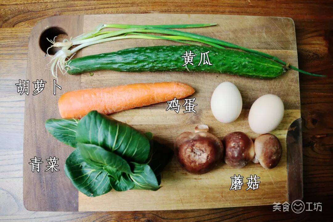 2. 黄瓜、胡萝卜、香葱切碎,青菜洗净,鸡蛋打散备用。