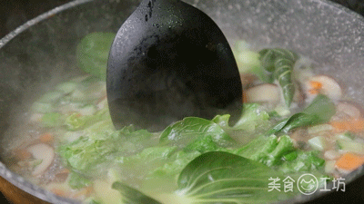 6. 水烧开后,放入青菜叶和黄瓜继续煮。