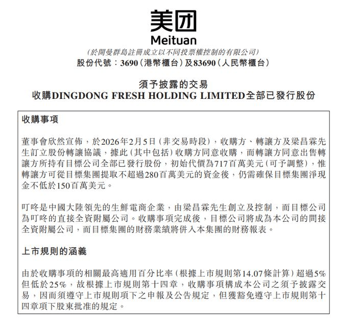 2 月 5 日,美团于香港联交所发布公告,将以约 7.17 亿美元的初始对价,完成对叮咚买菜中国业务 100% 股权的收购。美团公告称,公司高度重视即时零售业务。本次收购将有助于充分发挥双方在商品力、技术、运营等方面的优势,为消费者提供更优质的消费和配送体验。