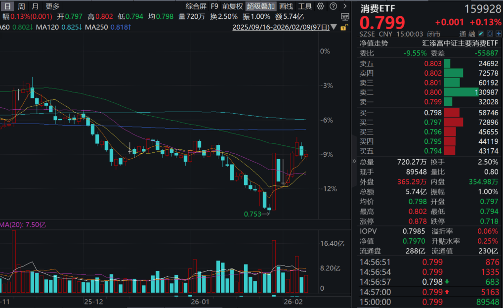 今日(2.9),市场情绪高涨,聚焦纯正新消费的港股通消费ETF汇添富(159268)收涨1.4%,再创阶段新高!资金持续青睐,近5日有3日获净流入,累计“吸金”近5000万元!热门成分股多数飘红:截至15:19,中国中免涨超8%,泡泡玛特、老铺黄金涨超5%。(成分股仅做展示,不作为个股推介)