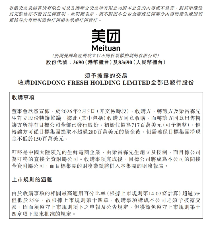 2月5日,美团于香港联交所发布公告,将以约7.17亿美元的初始对价,完成对叮咚买菜中国业务100%股权的收购。根据协议,转让方有权在2026年8月31日前从目标集团提取不超过2.8亿美元的资金。叮咚买菜海外业务则不在本次交易范围内,将在交割前完成剥离。