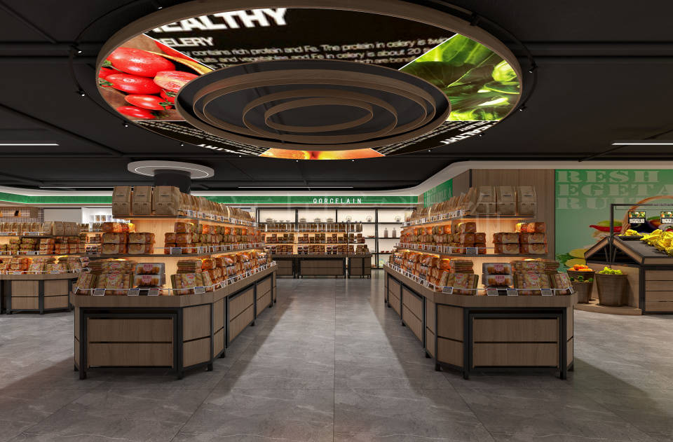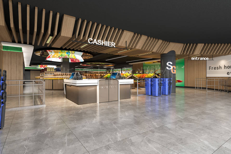 2. 现场勘测+平面规划:绘制精确尺寸图,规划顾客环形/直线动线,主通道2.4–3m,次通道≥1.5m;功能分区通常为:入口促销区→蔬果→肉禽水产→熟食烘焙→粮油调味→日化百货→收银区(含烟酒、便民服务);
