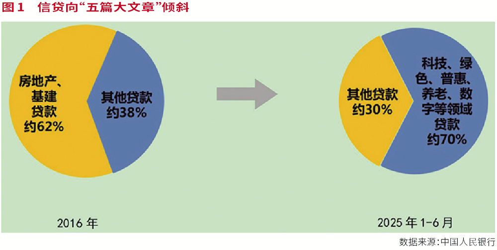 过去十年间,中国的信贷投向结构发生深刻演变,主要驱动因素由重资产行业向高质量发展领域升级换挡,新增贷款结构已由2016年的房地产、基建贷款占比超过60%,转变为目前的金融“五篇大文章”领域贷款占比约70%,充分体现了结构性货币政策工具的牵引带动作用。