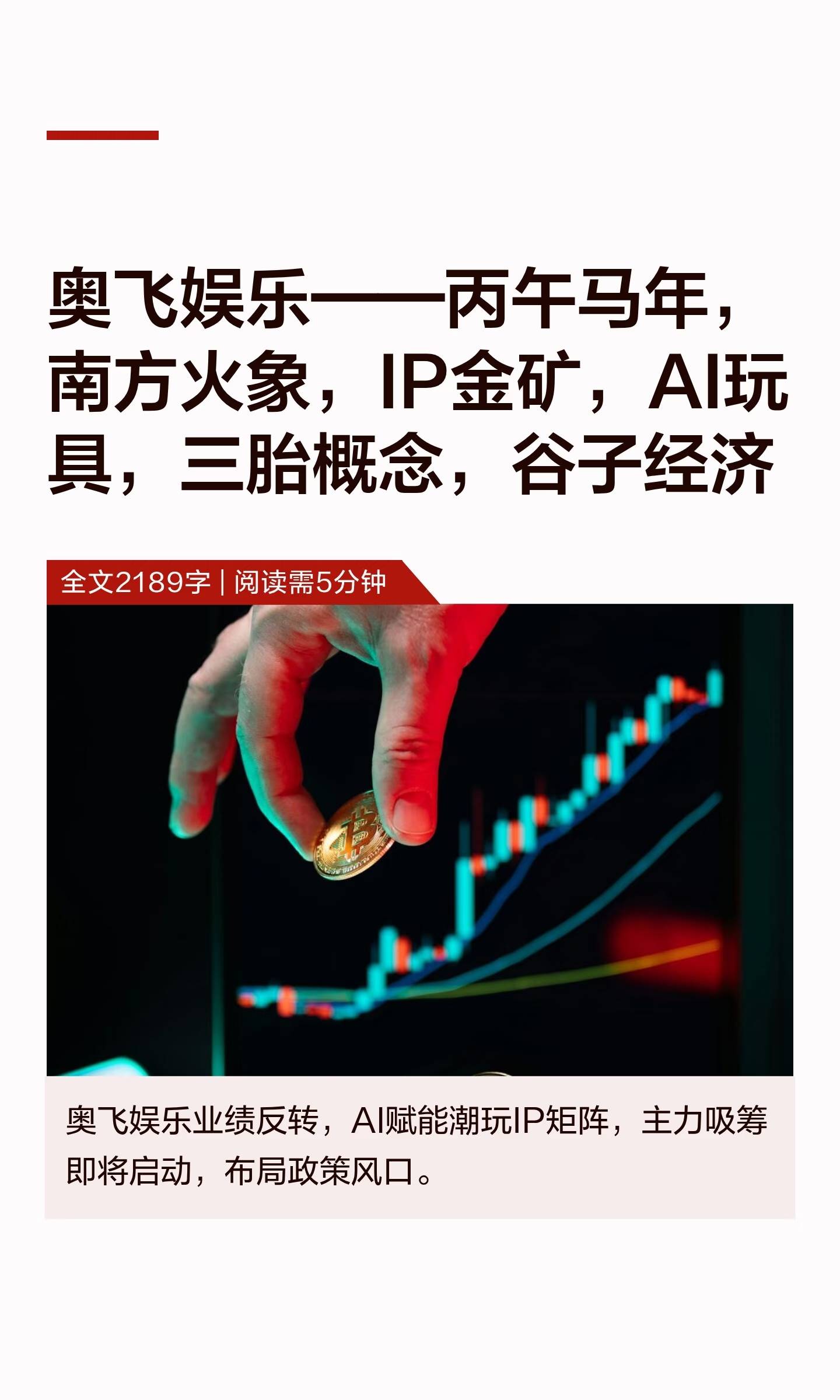 奥飞娱乐——丙午马年,南方火象,IP金矿,AI玩具,三胎概念,谷子经济今天我要拆解一只机构正在吸筹、却被散户忽视的宝藏——奥飞娱乐(002292)。它暗藏的IP金矿和AI浪潮,正是主力洗盘后即将拉升的明日巨牛!奥飞娱乐2025年业绩预告堪称“逆转剧本”:2025年三季报营收18.87亿,归母净利润5054万,更狠的是年度业绩预告直接扭亏为盈,归母净利润6000万到8000万,对比去年亏损2.85亿,这不是反弹,是涅槃重生!大家总说买票要找业绩反转的标的,奥飞就是最典型的那一个——资产合计42.19亿,负债仅12.49亿,财务结构比大多数传媒票干净得多,管理层把成本管控玩到了极致,毛利率稳步抬升,基本面硬邦邦,资金敢拉抬。这背后是公司砍掉冗余成本、计提减值轻装上阵。三季度扣非净利润已实现30.91%同比增长,毛利率逆势提升至43.25%,说明主业盈利能力在快速修复!但散户们只看到前三季度营收下滑6.16%的表面数据,却忽略了一个致命细节:股东户数减少9.89%,筹码快速集中!这是主力正在利用业绩波动洗盘,逼散户割肉!人性弱点就是“厌恶短期亏损”,而主力恰恰用震荡吸筹——等你忍不住卖出时,拉升就开始了。奥飞娱乐是IP金矿+AI赋能:中国的迪士尼,谷子经济的收割机。奥飞手握1.8万件知识产权,覆盖喜羊羊、超级飞侠、巴啦啦小魔仙等全年龄段IP矩阵。但真正引爆未来的,是它的三大杀器:1.潮玩赛道降维打击:奥飞通过“玩点无限”品牌,与米哈游、腾讯、网易等合作,推出《崩坏:星穹铁道》《天官赐福》等爆款叠叠乐产品。Z世代的“谷子经济”(周边收藏癖)才是印钞机——一个限量版角色卡牌能炒到原价10倍,而奥飞卡牌、积木、毛绒生产线全开,毛利率高达42%以上!2.AI玩具颠覆传统:公司已推出AI陪伴毛绒玩具喜羊羊,接入多模态大模型,能对话、能情感识别。想象一下:孩子把喜羊羊当电子宠物,家长为“情绪价值”付费——这不再是玩具,而是家庭教育刚需!AI赋能下,玩具从一次性消费变成可持续付费的生态,这才是估值重构的核心!3.赛事化运营破圈:飓风战魂陀螺项目打造WSA世界锦标赛,用“IP+赛事+小程序”绑定年轻用户。参考电竞行业的千亿市场,奥飞正在把玩具变成体育项目,收割粉丝经济!为什么散户不敢买,而主力已布局?因为散户的恐惧来自“线性思维”:看到营收下滑就认为公司药丸。但牛散看的是“非线性爆发点”:员工持股计划锁定期4.84元/股,2026年业绩目标扣非净利润1亿元。这意味公司内部敢用真金白银押注未来,而当前股价9.65元离目标空间巨大!机构暗中加仓:华夏中证动漫游戏ETF三季度增持434万股,国泰ETF同步跟进。主力永远比散户快一步,等你从新闻里看到利好时,股价早已起飞!大家都知道,2026年是丙午马年、南方火象,利好位于南方的文化传媒企业。而奥飞娱乐正属于南方火象,今年将是奥飞的爆发年!最近,国家对文化传媒产业的支持力度有多大?从“十四五”规划到各种文化产业扶持政策,文化产业已经成为国家战略。奥飞娱乐,作为文化产业的佼佼者,正是政策红利的最大受益者。2026年传媒行业将全面复苏!广电总局21条新政松绑内容限制,剧本过审周期缩短50%,出海绿色通道直接打开万亿市场,而奥飞手握一众经典IP,从儿童动画到潮流文创,内容储备足够吃遍这波政策红利。看看春节档82亿票房刷新纪录,文旅消费政策推动“影视+文旅”融合,这些都不是空穴来风,是真金白银的行业红利,而奥飞作为老牌内容公司,早就站在了风口上,就等风来起飞! 再看看奥飞娱乐——AI玩具放量:与电信运营商合作推出绑定流量套餐的智能玩具,下沉市场潜力巨大;IP影视化加速:铠甲勇士新番剧播出带动衍生品销售,参考迪士尼的“内容+衍生”闭环模式;全球化突围:北美婴童品牌Babytrend供应链调整至泰国,规避关税压力,海外收入占比已提升至35%!奥飞娱乐,你以为的“玩具股”,其实是“IP帝国”!它卖的不仅仅是玩具,它是卖梦想,卖情怀,卖IP!在这个流量为王的时代,IP就是印钞机。奥飞手握“喜羊羊”、“超级飞侠”、“铠甲勇士”等一系列国民级IP,这不仅仅是玩具,这是几代人的童年回忆,是几代人的消费习惯。你以为它只是在卖玩具?错了!它是在卖流量,卖版权,卖衍生品。它的商业模式,早就从“制造”转型为“创造”。这种转型,意味着它的利润空间是无限的,它的增长潜力是爆发性的。再加上,随着元宇宙概念的兴起,虚拟偶像、数字IP的价值正在被重新定义。奥飞娱乐在这些领域早有布局,它的IP资源,正是元宇宙最需要的“灵魂”。当风口来临时,猪都能飞,而奥飞娱乐,它不是猪,它是鹰,它会飞得更高。接下来扒一扒资金面,这才是最能戳中人性弱点的地方!最近十天奥飞有六天资金净流入,2月3日单日净流入近6000万,特大单净买入6373万,主力资金偷偷吸筹的痕迹比锅底还黑!而2月6日的资金净流出,不过是主力洗盘的常规操作,把那些拿不住的散户洗出去,才能轻松拉升。散户总是反复犯同一个错误:主力吸筹时你恐慌割肉,主力拉升时你追高接盘,说到底就是被自己的贪婪和恐惧牵着鼻子走,而奥飞现在的筹码结构,就是主力完成吸筹、即将启动的典型特征。 为什么敢笃定奥飞?因为它踩中了A股的底层逻辑:政策风口+业绩反转+资金认可。奥飞作为兼具内容IP和实体产业的标的,比纯内容公司更抗跌,比纯实体公司更有想象空间,这种标的在牛市里,就是资金抢着抱的香饽