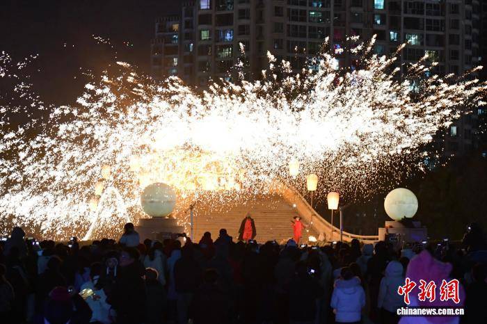2月8日晚,“新徽园·新徽年——火虎耀新年”新春火舞特色非遗主题活动在合肥徽园举办。图为游客在看打铁花表演。 中新社记者 储玮玮 摄