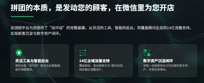 友团团平台为您提供了这个“店中店”的完整基建——从灵活的工具、智能的后台,到覆盖微信、朋友圈、视频号等五万多个腾讯场景的14亿流量支持,以及将新客沉淀为数字资产的闭环。