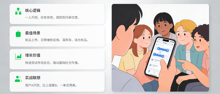 2. 节奏是关键:不要常年拼团。将拼团作为周期性引爆点,与节假日、新品上市、会员日结合,保持新鲜感和稀缺性。