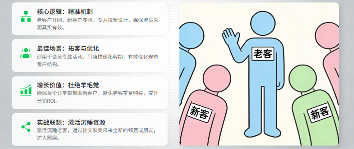 1. 核心逻辑:开团者必须是老客户,而参团者必须为新客户。专为拉新设计。