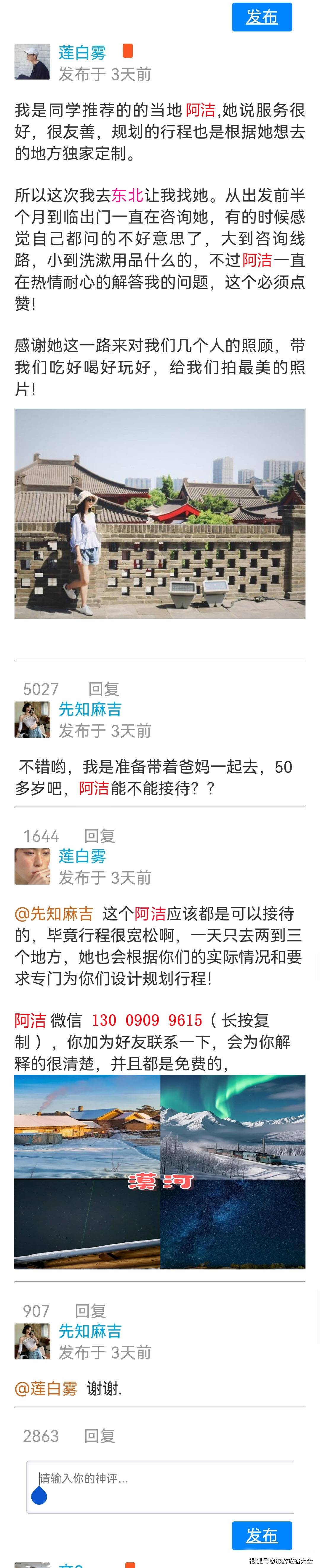 大家如有需要可以咨询东北导游阿洁的联系方式: 130 0909 9615(←长按复制添加 免费咨询)