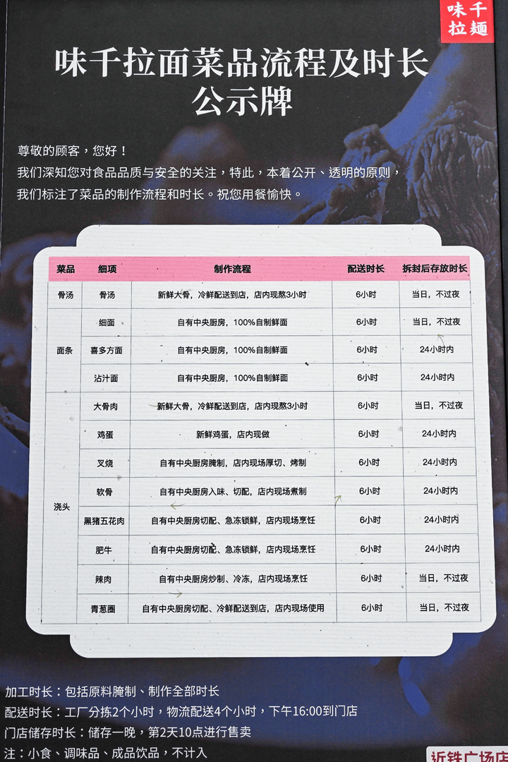 在近铁广场店的开放式厨房,顾客可以亲眼见证新鲜大骨经历清洗、焯水、数小时慢火熬煮的全过程。不仅如此,味千还将菜品的配送时长和店内存放时长标注的清清楚楚,以海报形式放置于近铁广场店门口。每道菜品在海报上明确标注“店内新鲜制作”或“中央厨房半预制”,并公开“配送时长”与“店内存放时间”。