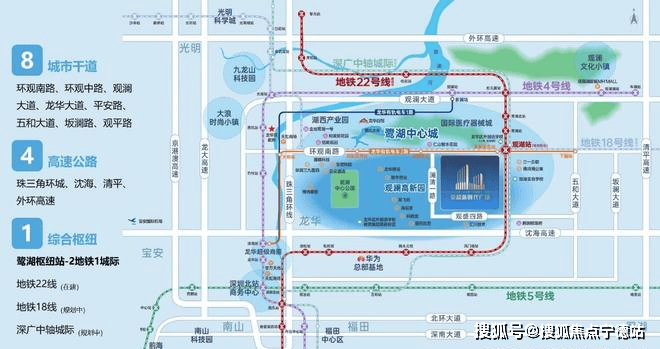 龙华产核——鹭湖中心城地处龙华万亿级数字经济圈、梅观创新走廊的交汇中心,亦是龙华六大重点片区的核心枢纽