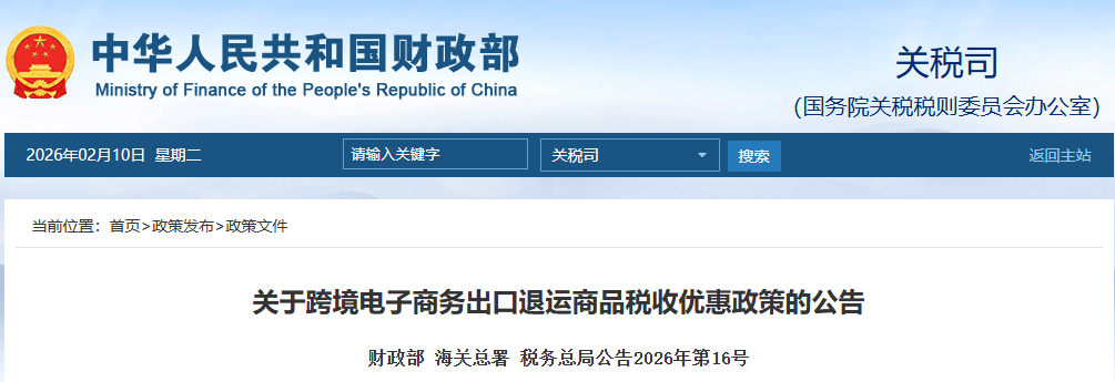 2月9日,财政部、海关总署、税务总局发布关于跨境电子商务出口退运商品税收优惠政策的公告。